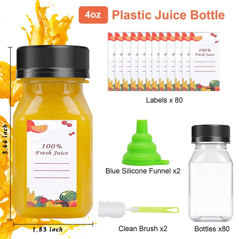 OBKJJ 80pcs 4oz Plastic Juice Bottles, Juice Bottle with Caps Reusable Empty Clear Bottles with Label, Funnel, Brush Bulk Beverage Containers for Juicing, Drinking, Smoothie and Other Beverages