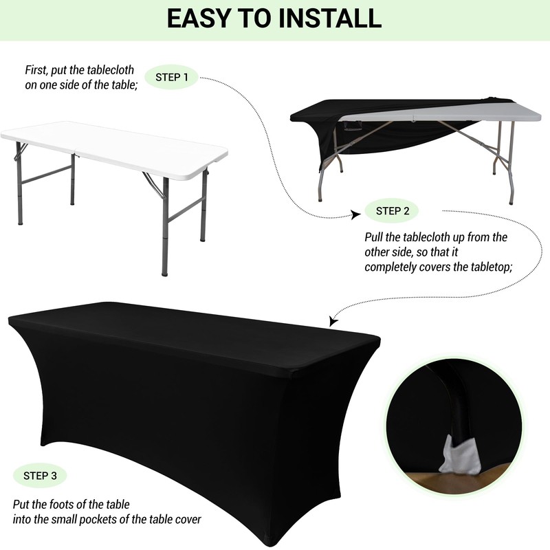 - Features 4 Elastic leg pockets to put the banquet table legs in: The sewn-in leg pockets secure and cover table legs ensuring that every part of the rectangular table is covered and spandex table cloth cover is displayed uniformly