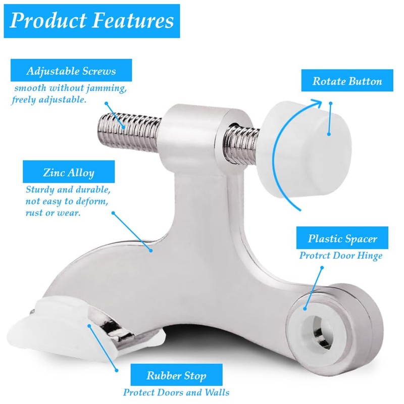 - Size: The adjustable screw length at the top of the door stop is 1.63 inch, the length at the bottom is 2.5 inches, the height is 1.75 inches, the width of the rubber bottom pad is 0.7 inches, and the diameter of the hole is 0.25 inches.