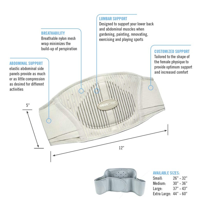 Designed to promote proper posture and good body mechanics to help maintain a healthy back, reduce back pain and prevent back pain injuries due to lifting, pushing, pulling, walking, exercising and repetitive bending or twisting. The ObusForme Back Belt comes in four sizes specifically tailored to the shape of the female physique. Lightweight; Sleek, stylish, low profile. Wear on top of or under clothing Designed for industrial and/or personal usage; any profession and task where proper posture and good body mechanics are important Ideal for mild low back pain, strains, or sprains Beneficial when used in conjunction with a rehabilitation program All materials are hypoallergenic; hand-wash