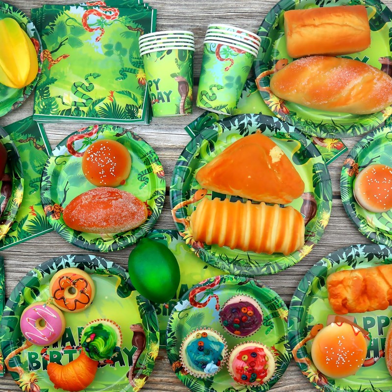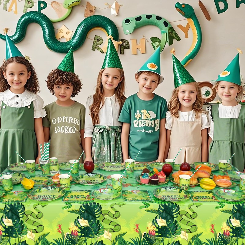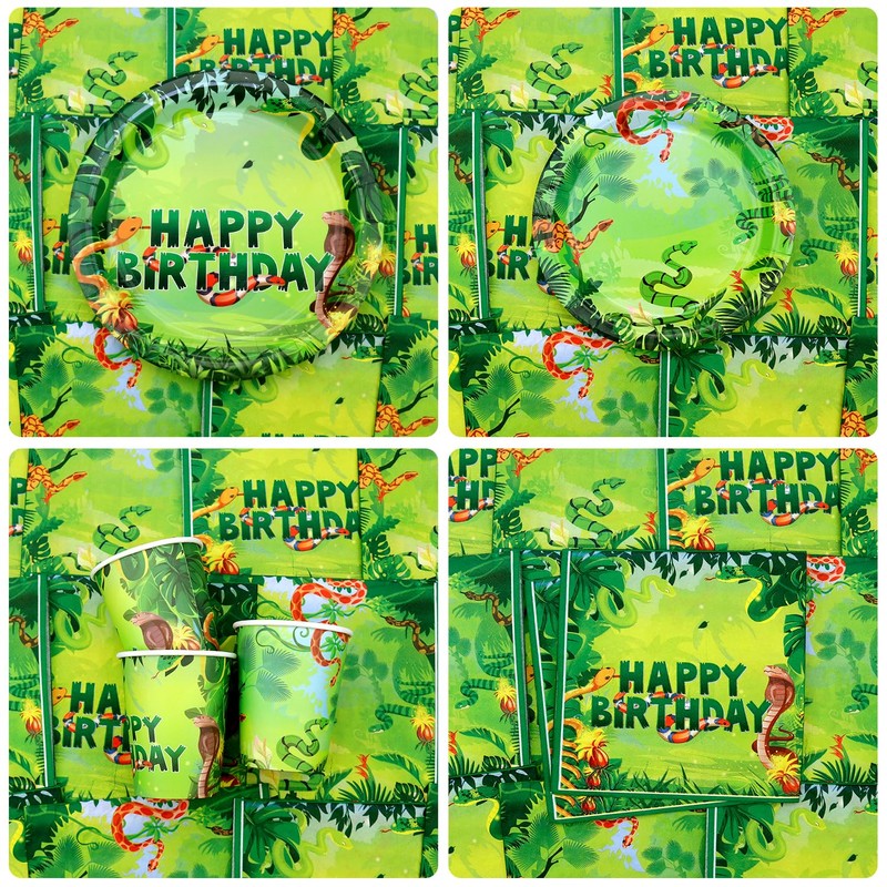 - Snake Party Tableware Supplies Kit: You will gain 20 9"dinner plates + 20 7" dessert plates + 20 9oz paper cups + 20 napkins + 20 straws + 1 tablecloth.