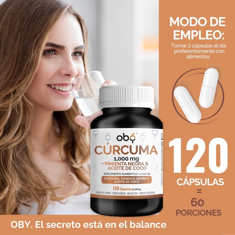 - 💊 Sólo toma 2 cápsulas al día (preferentemente con alimentos). Incluir Oby Cúrcuma en tu rutina diaria es muy sencillo.