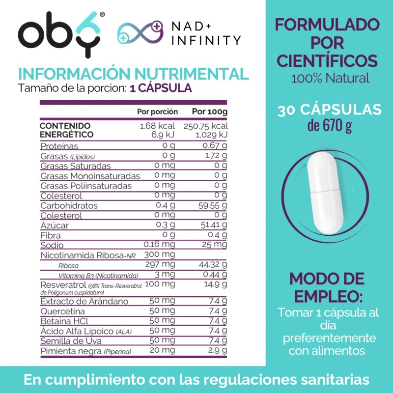- OBY NAD+ Resveratrol Potenciado 8 Ingredientes: Nicotinamida Ribosa (NR), Trans Resveratrol al 98%, Ácido Alfa Lipoico (ALA), Quercetina, Semilla de Uva, Arándano, Betaina HCl 97% y Piperina (Pimienta Negra). 100% Vegano. OBY NAD+ Infinity 30 cápsulas de 670 mg (para 30 días) es un suplemento alimenticio premium de OBY 100% vegano. Quienes buscan mayor energía, mejorar el metabolismo celular y protección para combatir el envejecimiento, OBY NAD+ Trans Resveratrol Infinity es para ti: el único en su categoría con 8 ingredientes premium. El NAD es una molécula presente en nuestro cuerpo que es fundamental para nuestra energía y bienestar. Es el combustible que nuestras células necesitan para funcionar al máximo. El NAD+ participa en procesos clave como la producción de energía celular, la reparación del ADN y la regeneración de las células. Sin embargo, con el tiempo, sus niveles disminuyen, lo que afecta nuestra vitalidad y salud. Cuando el NAD+ se combina con antioxidantes como el Trans