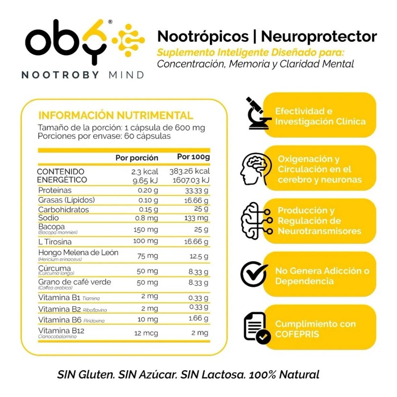 Oby Nootropicos Neuroprotector Concentracin, Memoria, Claridad Mental Sin sabor Vitaminas Mujer y Hombre