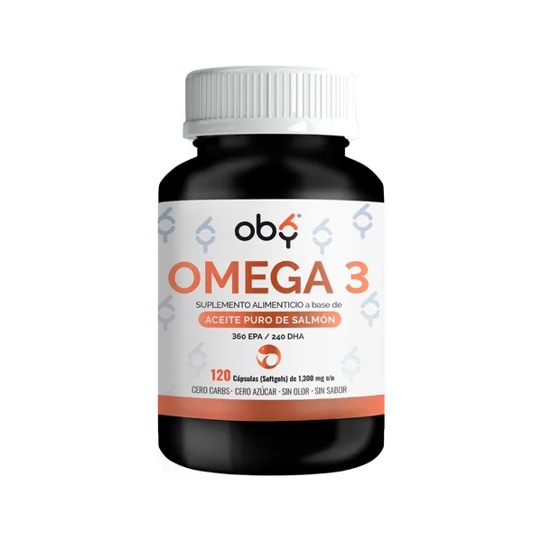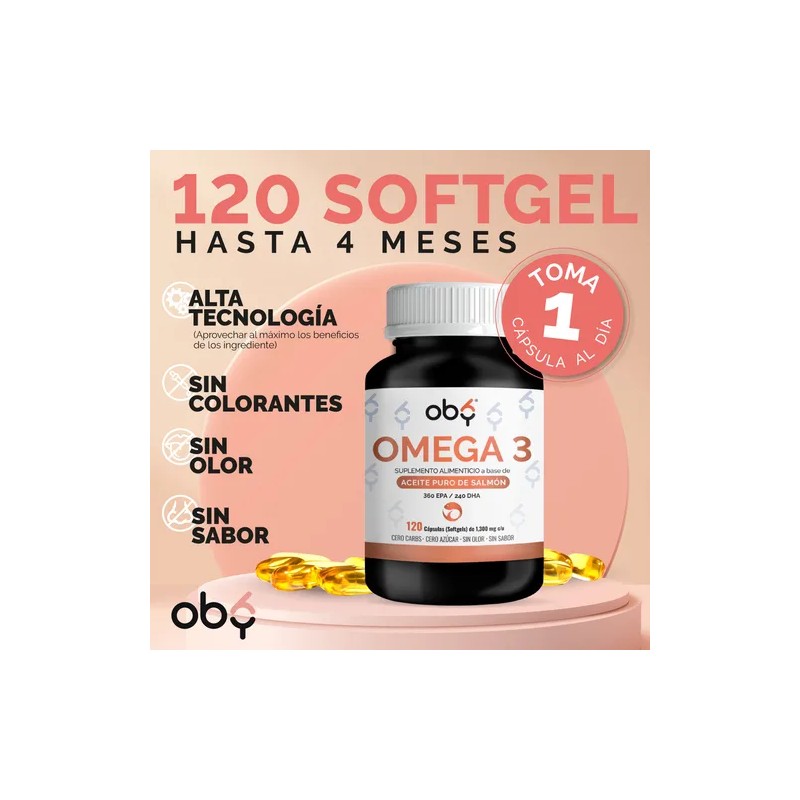 Omega 3 Premium Oby: 1300mg con Aceite de Salmón Salvaje Puro, alto en EPA (360mg) y DHA (240mg) por cápsula. 120 softgels sin sabor ni olor. ¡Soporte para corazón, cerebro y bienestar general por 4 meses! 🐟🧠❤️