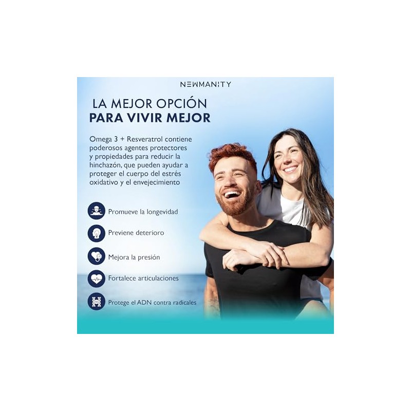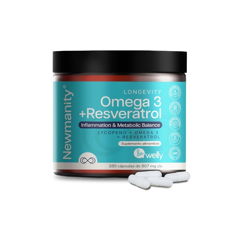 NEWMANITY Omega 3 + Resveratrol, Te Verde, Vitamina C y Licopeno – 3 meses – Suplemento con Omega 3 EPA+DHA – Antioxidantes Naturales – Cápsulas Vegetales