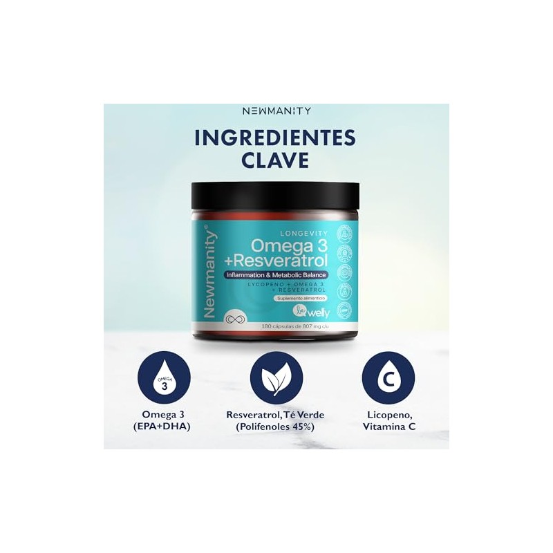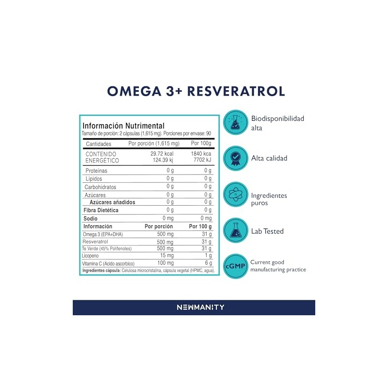 Acerca de este artículo Fórmula antioxidante completa: Nuestro suplemento combina Omega 3 (EPA+DHA), Resveratrol, Té Verde (45% polifenoles), Licopeno y Vitamina C, todos conocidos por sus beneficios antioxidantes y su papel en una nutrición equilibrada Alta biodisponibilidad y calidad: Cada porción contiene 500 mg de Omega 3 y 500 mg de Resveratrol, cuidadosamente formulados para ofrecer absorción efectiva y resultados consistentes, con ingredientes de alta calidad y pureza Sin ingredientes animales ni añadidos innecesarios: Cápsulas vegetales (HPMC) sin conservantes ni aditivos artificiales. Una opción práctica para quienes siguen una alimentación basada en plantas o buscan alternativas más naturales Suministro para 90 días: Con 180 cápsulas por envase, obtienes una dosis diaria constante durante 3 meses. Ideal para mantener una rutina de suplementación sin interrupciones Fácil de incorporar a tu rutina: Cápsulas ligeras, sin sabor ni olor fuerte, que se integran fácilmente a tu día a día. Perfectas para quienes buscan un refuerzo natural y práctico