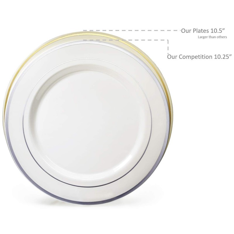 - 150 Piece Set pack ( 25 Guests ) Includes: 25 x 10.5 '' Dinner Plates + 25 x 7.5'' Appetizer / Dessert Plates + 50 forks, 25 spoons, 25 knives (Gold Coated)