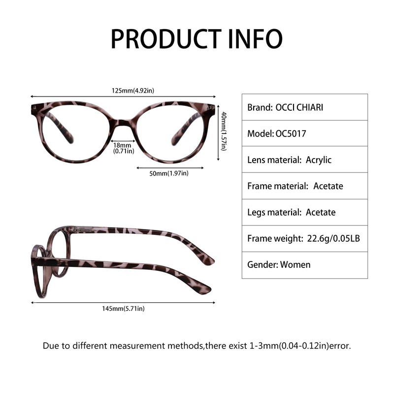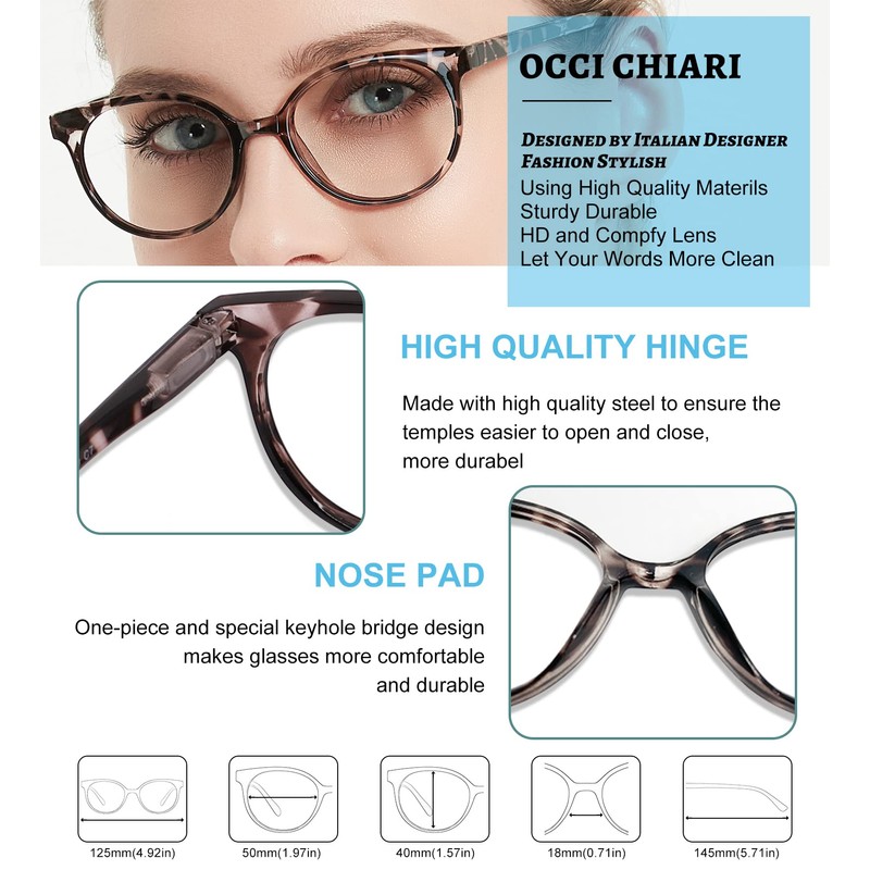 - Crystal clear lens :OCCI CHIARI reading glasses has optical,strong,durable frame and clear acrylic ,non-polarized, Round lenses.The acrylic lenses are clear enough. This women’s sturdy reading glasses 1.0 have A-class clear lenses which have higher precision as well ,makes the vision clear,give you a very big and sharp view,weren't so reflective and scratch resistant lens