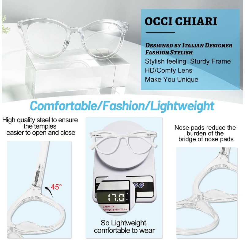 - Clear lens/good magnification :OCCI CHIARI lense is made of the acrylic lenses,is clear enough. This reading glasses have A-class clear lenses which have higher precision as well ,Use them daily for small print reading,makes the vision clear,give you a very big and sharp view,this reader glasses have 1.0x, 1.25x,1.5x, 1.75x,2.0x, 2.25x,2.50x,2.75x, 3.0x 3.5x 4.0x 5.0x 6.0x strength for selection