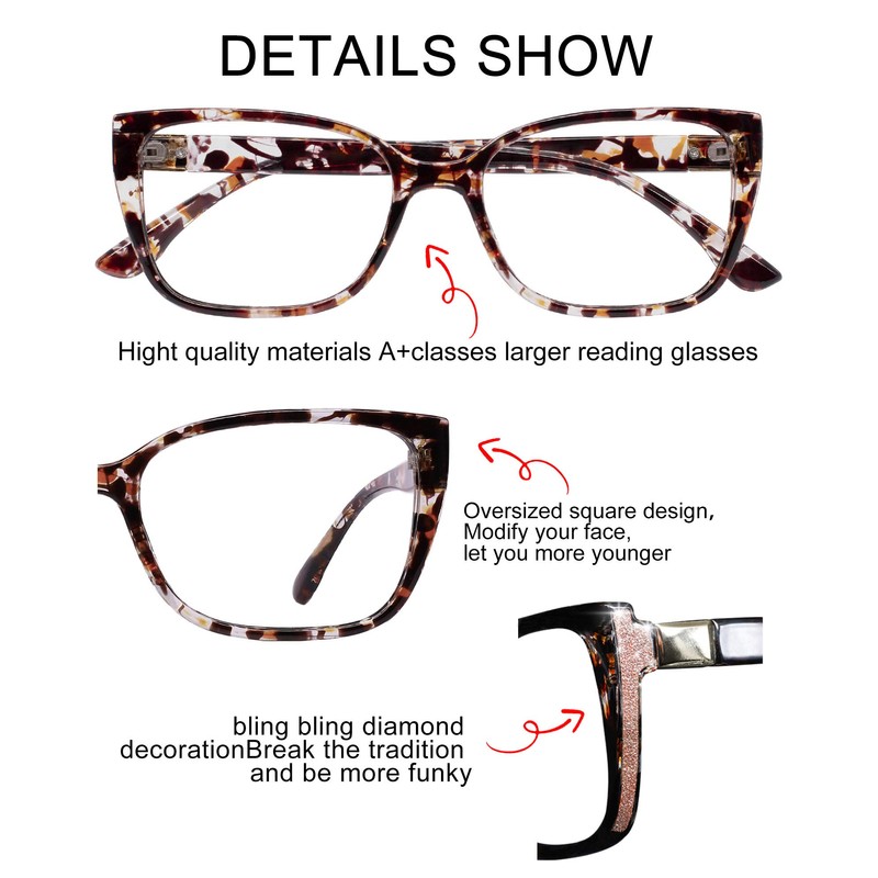 • Crystal Clear lens : reading glasses has optical,strong,durable frame and clear acrylic ,non-polarized, square lenses.The acrylic lenses are clear enough. This women’s sturdy reading glasses have A-class clear lenses which have higher precision as well ,makes the vision clear,give you a very big and sharp view,weren't so reflective and scratch resistant lens ,this reader glasses have 1.0x, 1.25X 1.5x,1.75X 2.0x,2.25X 2.50x 2.75X .0x 3.5x 4.0x 5.0x 6.0x strength for selection.