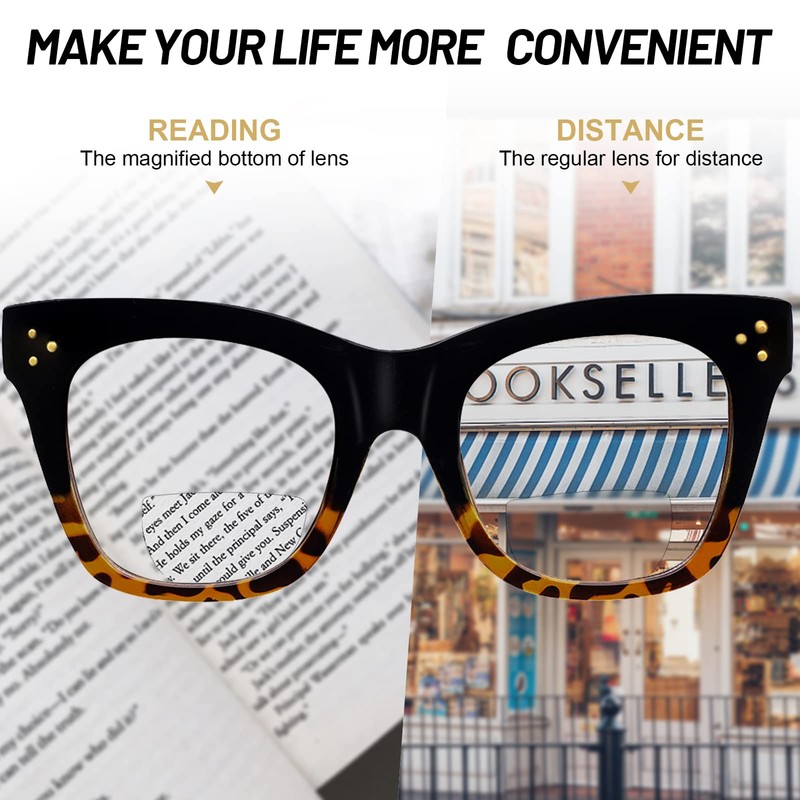 Bifocal reader glasses has clear vision by distance and reading area. Distance lens help to look far away with normal vision. Reading lens help to read, write, enjoy screen time by magnifying small print. Without taking it off.