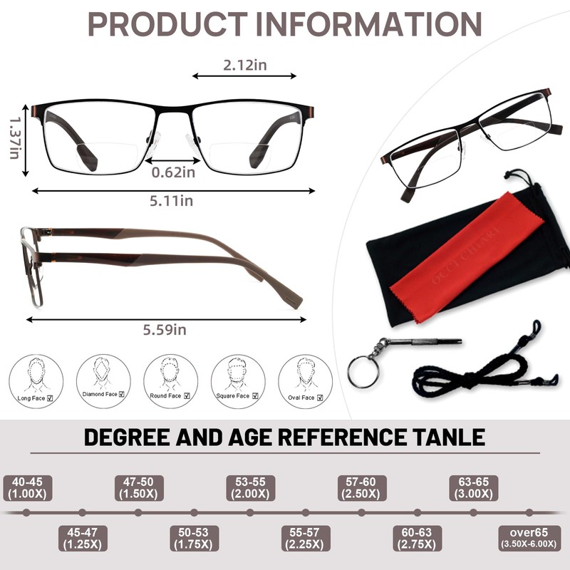Lens magnification/strength: OCCI CHIARI reading glasses 1.0x 1.5x 2.0x 2.5x 3.0x 3.5x You can choose the magnification according to the actually need,let OCCI CHIARI bifocal reading glasses become an important part of your life!