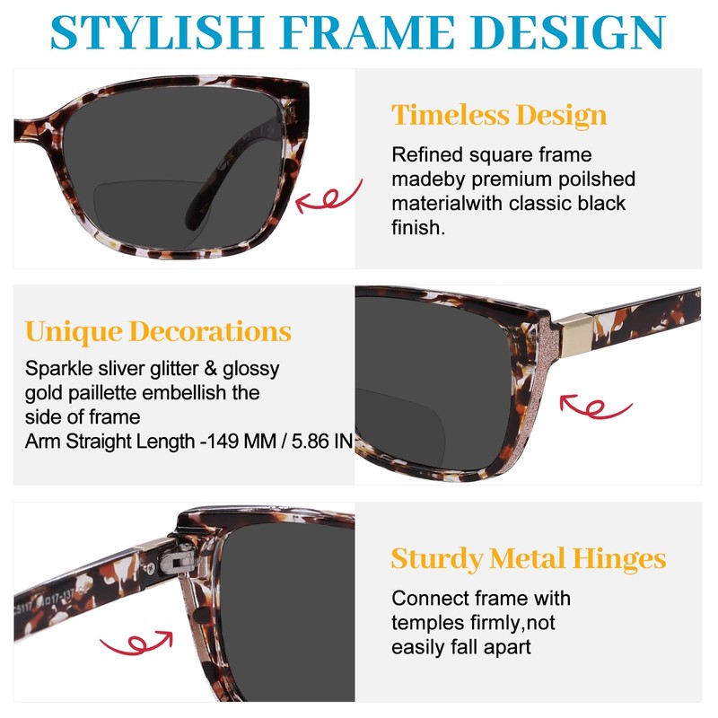 - [Face-enhancing frame shapes] The gently curved frames and proportionate sizing work to enhance different face shapes. Round faces get a touch of angularity, square faces get softening curves, and oval faces get accentuated elegance. Special eye-catching sparkles side design adds a touch of glamour, making these bifocal 2.0 reading sunglasses a style statement, elevating your look instantly.