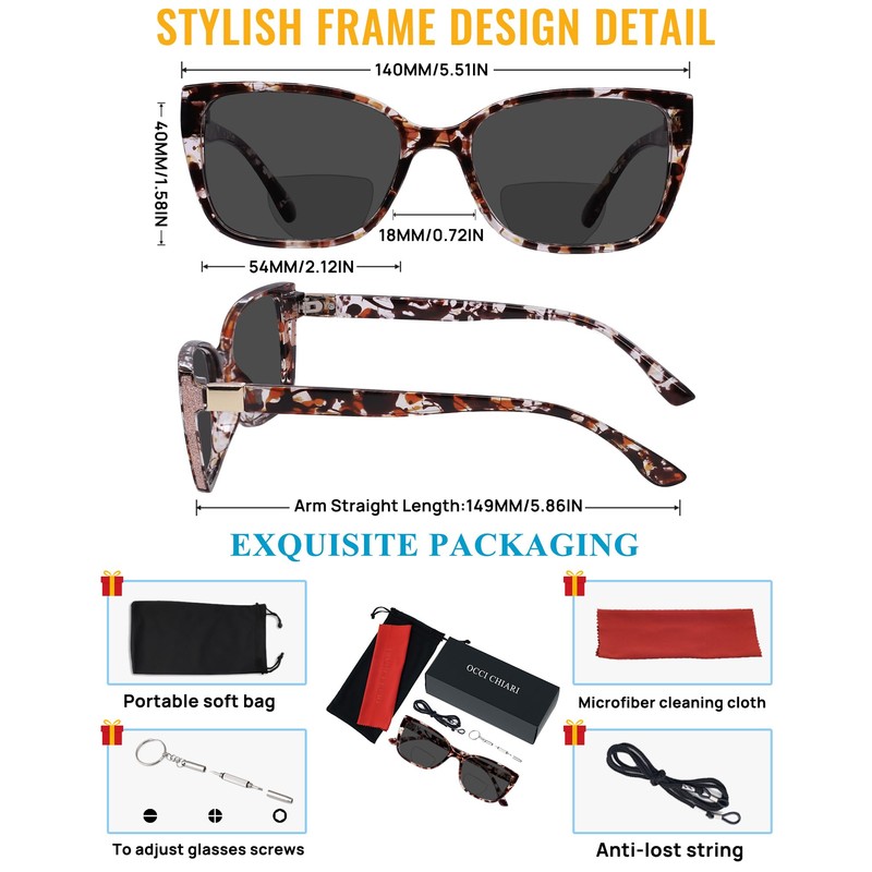 - [Size & Exquisite package] Lens width-54mm(2.11”), Lens height-44mm(1.71”), Bridge-18mm(0.7”), Frame width-140mm(5.53”), Frame length-146MM(5.75”). Packaged in brandy box, with valuable accessories. A thick portable bag to store these sun bifocals. A soft cleaning cloth to wipe the lens gently. A mini screwdrivers to adjust your glasses for comfortable wearing. A versatile anti-lost glasses rope to hang around neck for avoiding lose when cooking or walking.