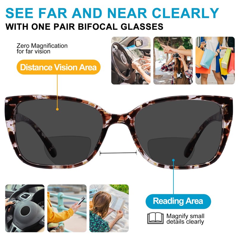 - [Functional bifocal sunglasses 2.0 : see near & far effortlessly] Tired of switching between sunglasses and reading glasses? Our bifocal design solves that! The upper part shields your eyes from harsh UV rays for clear distance vision—perfect for outdoor walks or driving. The lower segment acts as reading glasses, letting you breeze through menus, books, or phone screens under the sun. One pair, double the convenience!