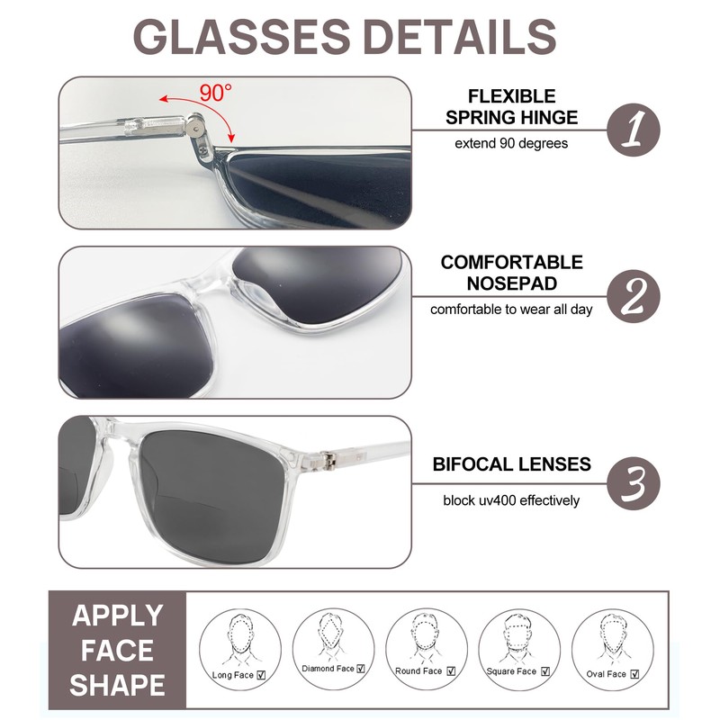 - Large square frame with flexible spring hinge: This clear reading sunglasses design suitable for people who loves fashion.Large frame bring a wide vision&high definition lenses can see the spots easily. High elastic temples can extend 90°, no worry about pinch your face,perfect fit for most of face type,make comfy all day.