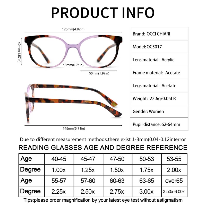 OCCI CHIARI Blue Light Blocking Glasses 2.00,Accute Magnification Lady's Readers 1.0 1.25 1.5 1.75 2.0 2.25 2.5 2.75 3.0 3.5 4.0 5.0 6.0