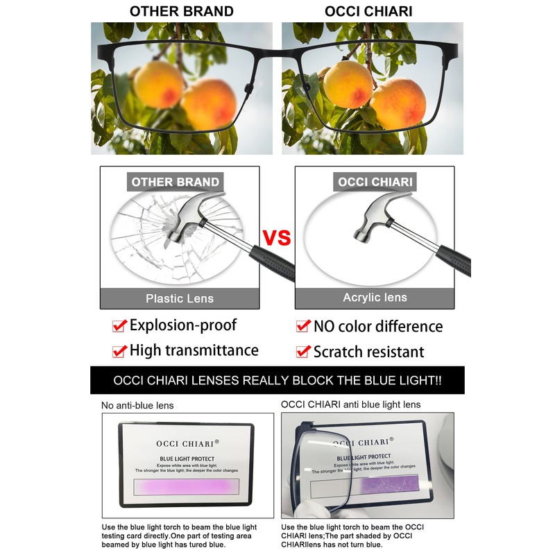 - OCCI CHIARI Package Included: 1*blue light blocking reading glasses for men, 1*Free Glasses Pouch (value $5 , protect your lenses from scratches), 1*Dust Cleaning Cloth (value $1 , avoid fingerprints and cracks) ,In case any broken problem happens, contact the seller without hesitation to solve the problem until satisfaction. You have no risk to try and we will provide you the best service!