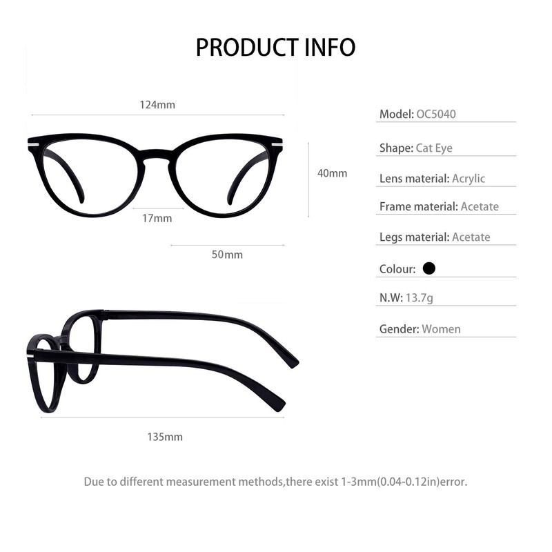 - Dimension:Lense Width(av)-Bridge-Arm :50-17-135mm (1.97-0.67-5.32 IN) .lenheight(bv):40mm/1.58in.Fashion glassecan be used aa match or a for reading glasses. Pretty optical glasses.Oval shape.durable sturdy .Magnification:0 100 125 150 175 200 225 250 275 300 325 350 400 500 600.
