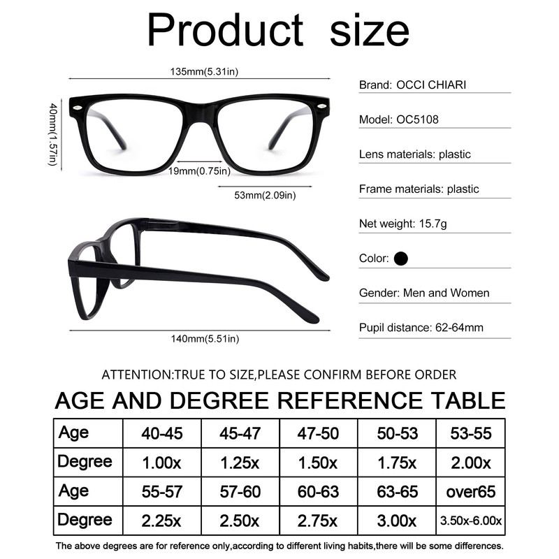 Lens magnification/strength: OCCI CHIARI reading glasses 1.0x 1.5x 2.0x 2.5x 3.0x 3.5x 4.0x 5.0x 6.0x.You can choose the magnification according to the actually need,let OCCI CHIARI reading glasses become an important part of your life!
