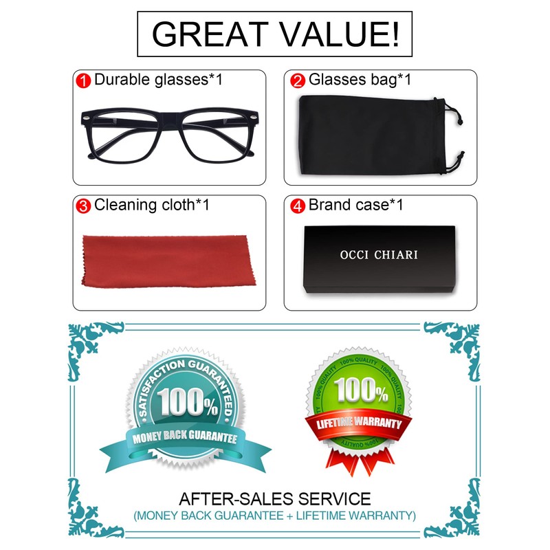 • Gift & Service: 1*OCCI CHIARI Fashion Reading Glasses for men and women, 1*free glasses pouch(about value $2.5) , 1*dust cleaning cloth(about value$1.00) to help protect your glasses from dirt, fingerprints and from breaking,so you would save your money.90 DAY MONEY BACK GUARANTEE: In case any broken problem happens, contact the seller without hesitation to solve the problem until satisfaction. And enjoy a lifetime lens warranty