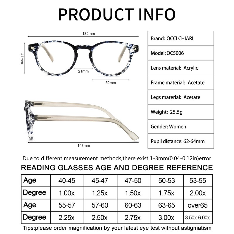 • Measurement:Lens width-52mm(2.05’’),Bridge-21mm(0.83’’),Arm-148mm(5.83’’),Frame width-132mm(5.20’’),Frame height-41mm(1.61’’),The magnification are 0 1.0x, 1.25x, 1.5x, 1.75x, 2.0x, 2.25x, 2.5x, 2.75x, 3.0x,3.5x 4.0x 5.0x 6.0x strength for selection.