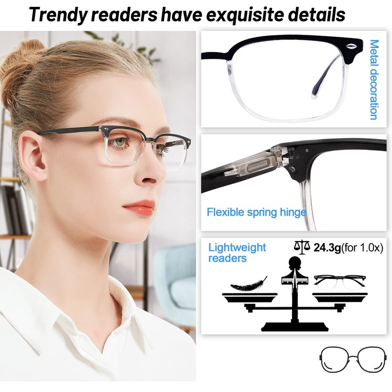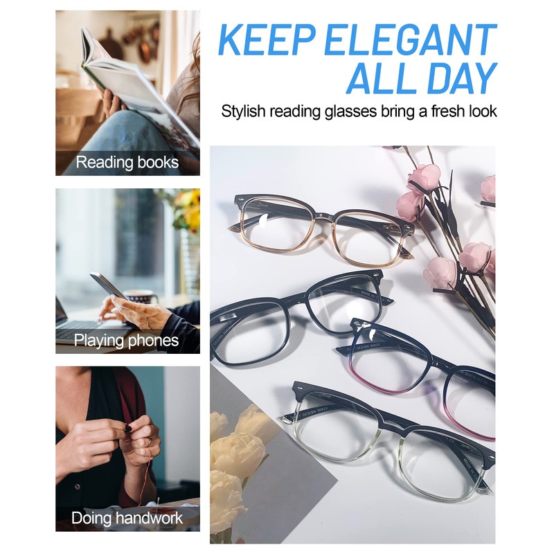 - Note: A protective film is attached to each lens. To ensure a clear view, please tear it off before use. Multifunction Reading Glasses for women and men - perfect for eye protection when using digital products, sticking to eye health .The Reading glasses for women and men that will anti eye fatigue when working on a computer , tablet , phone or television . Import lenses, optical correction and maximum precision for long-term comfort using. Anti-shock, wear resistant, workplace lens.