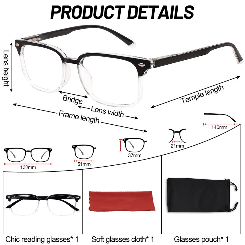 Package:one Included 1*Reading Glasses for Women and Men, 1*Free Glasses Case, 1*Dust Cleaning Cloth to help protect your glasses from dirt, fingerprints and from breaking.