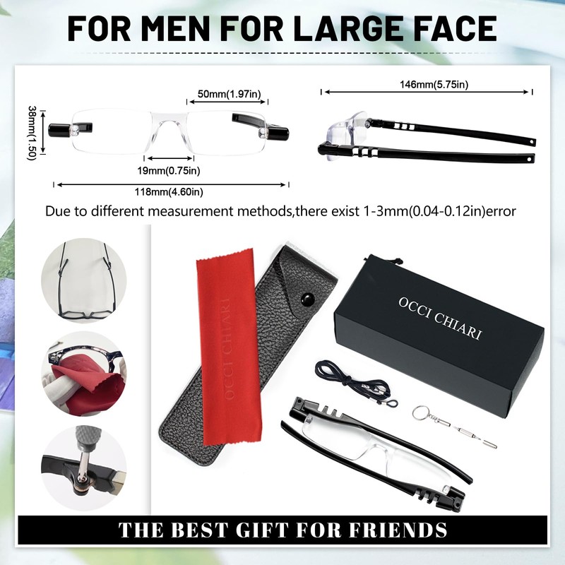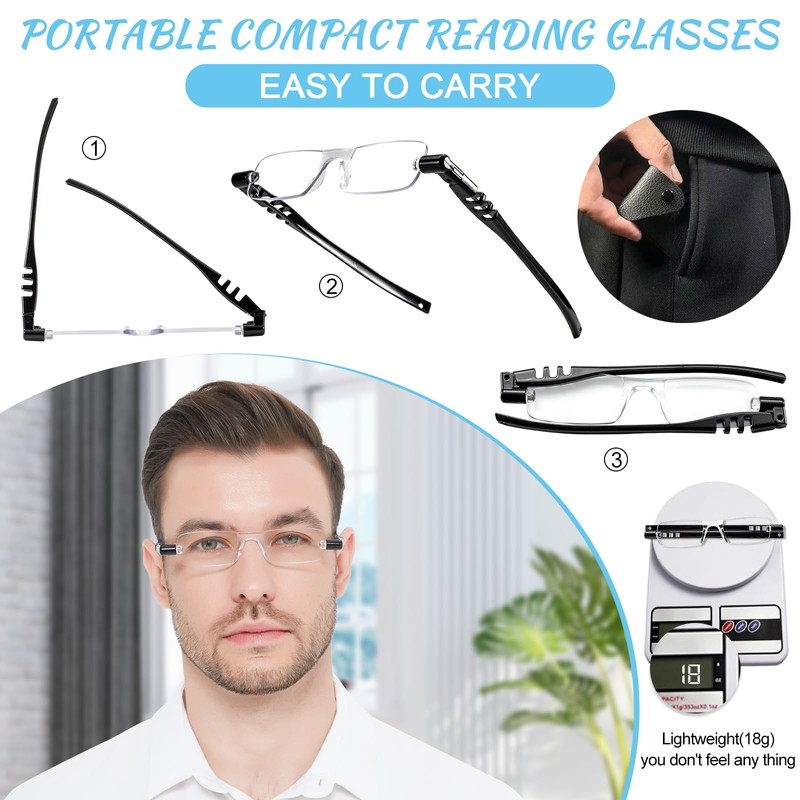 - 360 Rotating folding design: Our foldable reading glasses redefine on-the-go eyewear compact, collapsible, and chic, these glasses are designed for those who appreciate the finer details,Embrace the freedom of our pocket reading glasses,legs that can rotate freely, and the glasses can be worn on both sides, these folding reading glasses are slim and lightweight, making them perfect for men and women on the go.