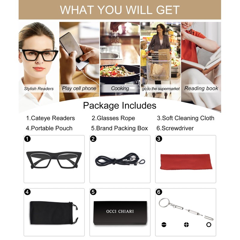 OCCI CHIARI women’s reading glasses can help you see nearby things more convenient. For example, when you read a book, do needlework, or use a mobile phone, you can wear reading glasses to make your line of sight clearer.
