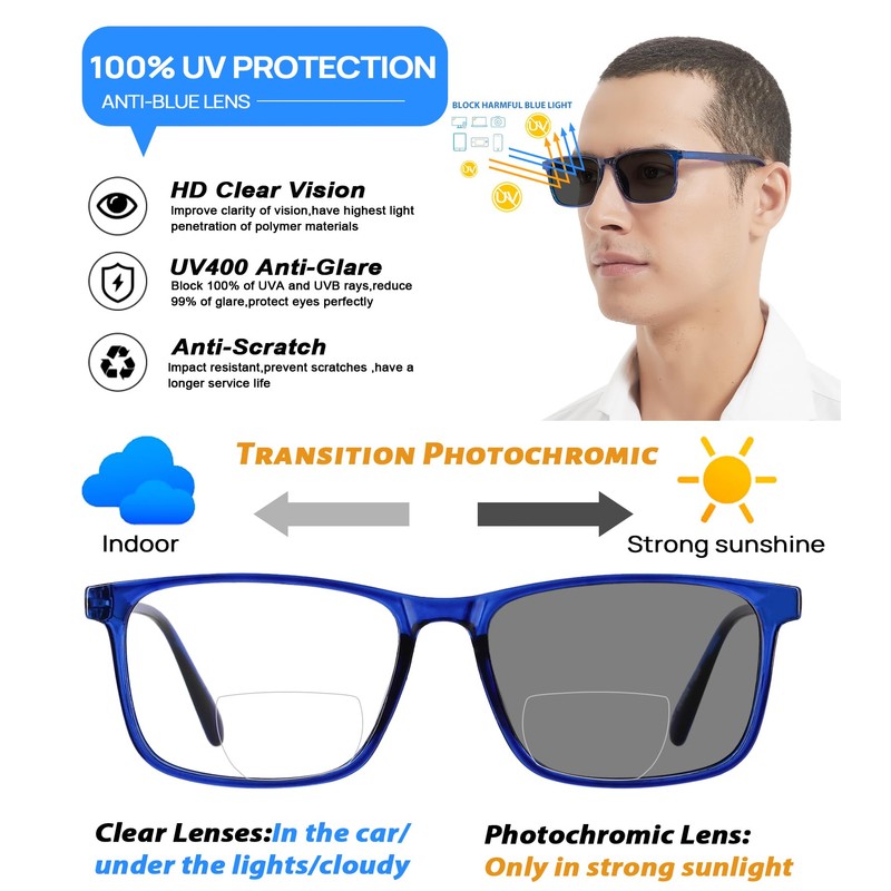 - Photochromic lens for indoor/outdoor : Lenses will automatically darken when exposed to UV sunlight and have UV400 protection. Once you are indoors or at night, the lens will return to colorless and transparent within a few minutes.wearing these readers are suitable for anywhere,no matter when you at home or outdoor, also they’ve been perfect for reading and keeping an eye on the kids when you are on pool