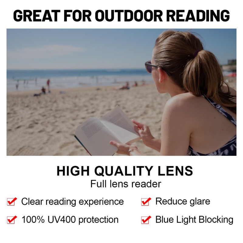 100% UV400 eye protection reading sunglasses for women, effectively & blocks glares reflected by mirrors, shiny or polished materials or any other kind of sun rays reflection, give you a natural & clear vision; Sturdy ,scratch resistant lens and shatterproof; bring you good visual experience when you are reading outside