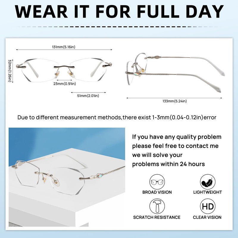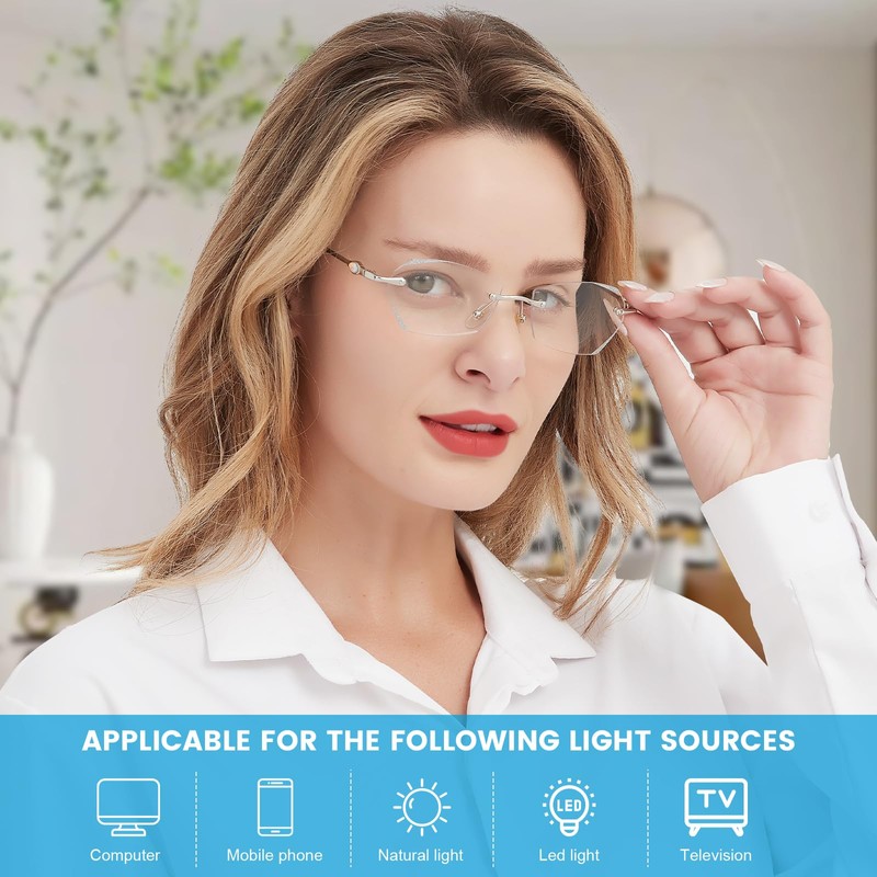 - Chic design&Rimless lightweight:metal legs with diamond ,chic and stylish,Rimless design(only 21g), and silicone nose pads, you would feel confort to wear full day,can adapt to women with small face, durable for long-term use,The nose pad fit the bridge of the nose, preventing glasses from slipping and imprinting the skin.The nose pad is designed to make the glasses likely to fall off when you are looking down or exercising Classic rectangular rimless frame design