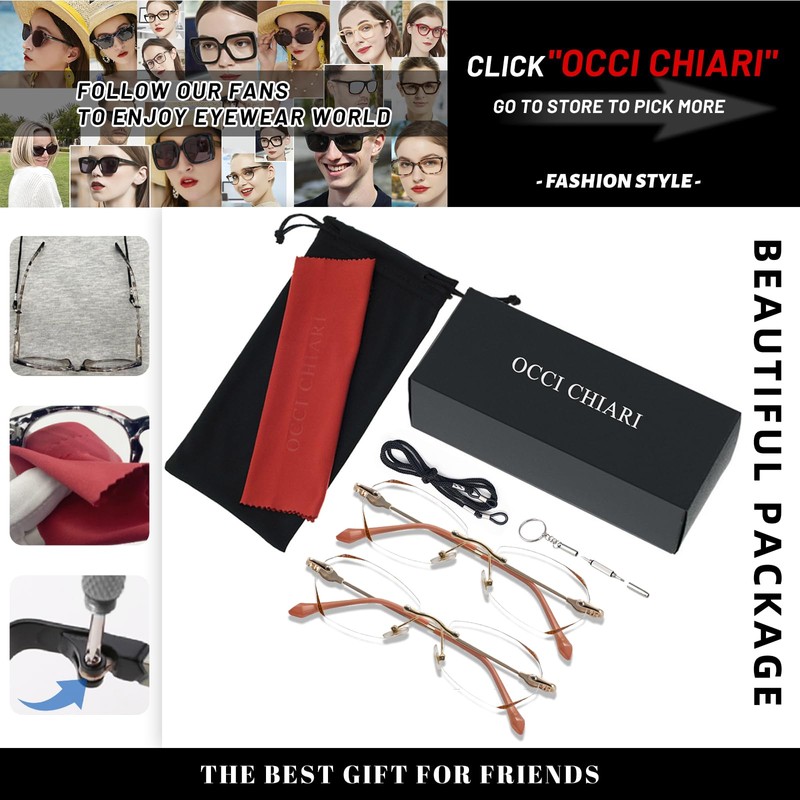OCCI CHIARI Rimless Blue light Reading Glasses 2.0x Women 2 Pack Readers Designer Eyeglasses(1.0 1.5 2.0 2.5 3.0 4.0)