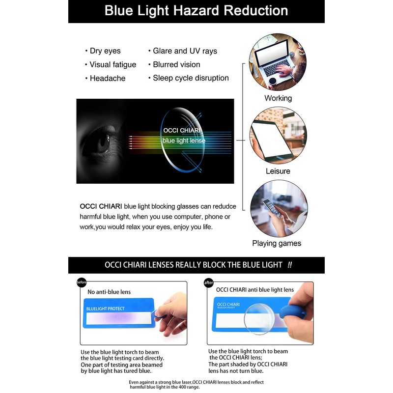 lenses:Those are designed to pass as much non-blue light through as possible .It can effectively block ultraviolet radiation ,provide 100% UV400 protection and filter harmful blue light,it is suitable for use when watching TV and look at computer.Lightweight frame is the perfect choice for both outdoor and indoor activities such as indoor office use, walking, travelling, taking photos, and is suitable as high fashion accessory.