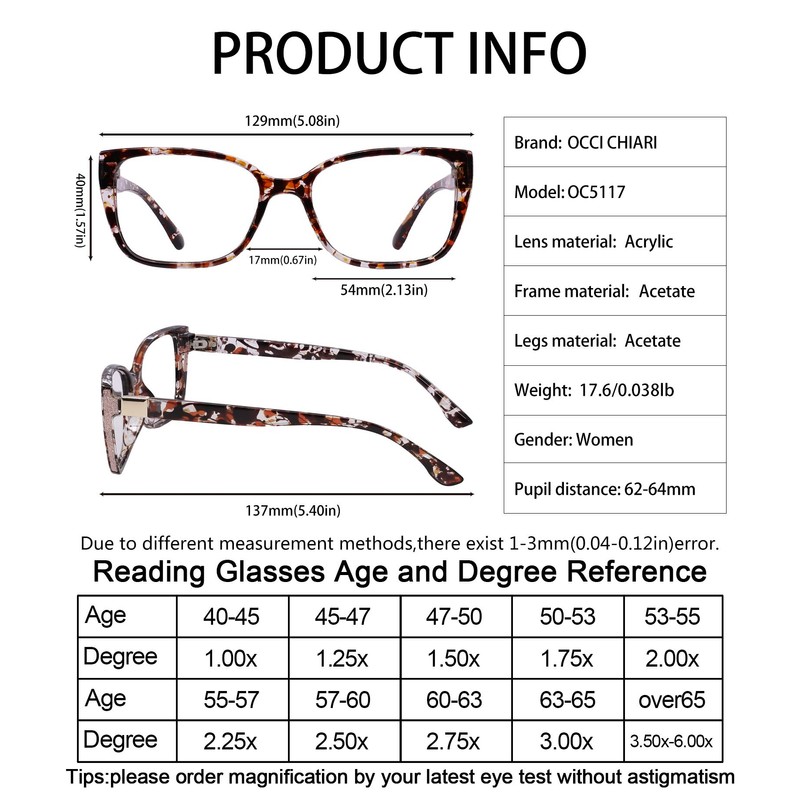 • Reading glasses size: Frame width-5.08’’(129mm),Lens width-2.13’’(54mm), Lens height-1.57’’(40mm), Bridge-0.67’’(17mm), Arm length-5.40’’(137mm).