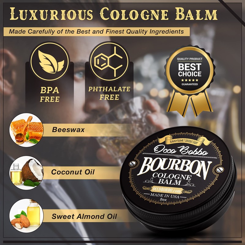 - Occo Bobbo – Funny name, serious smells. Our manly cologne balm is made from the finest Beeswax, Coconut oil, sweet almond oil, and phthalate free fragrances. Subtle sexy and masculine.