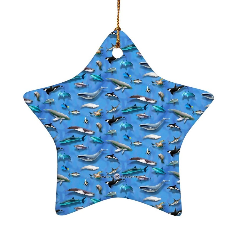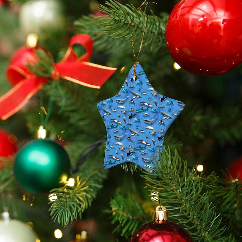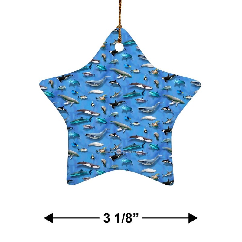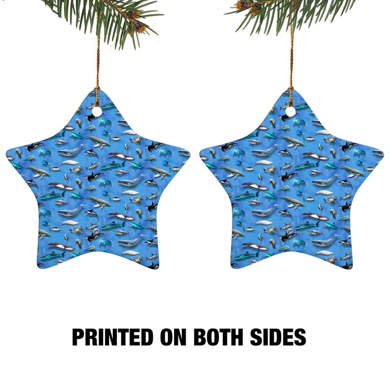 Ocean Life Whale Dolphin Manatee Shark Pattern Star-Shaped Porcelain Holiday Christmas Tree Ornament - 3.1"
