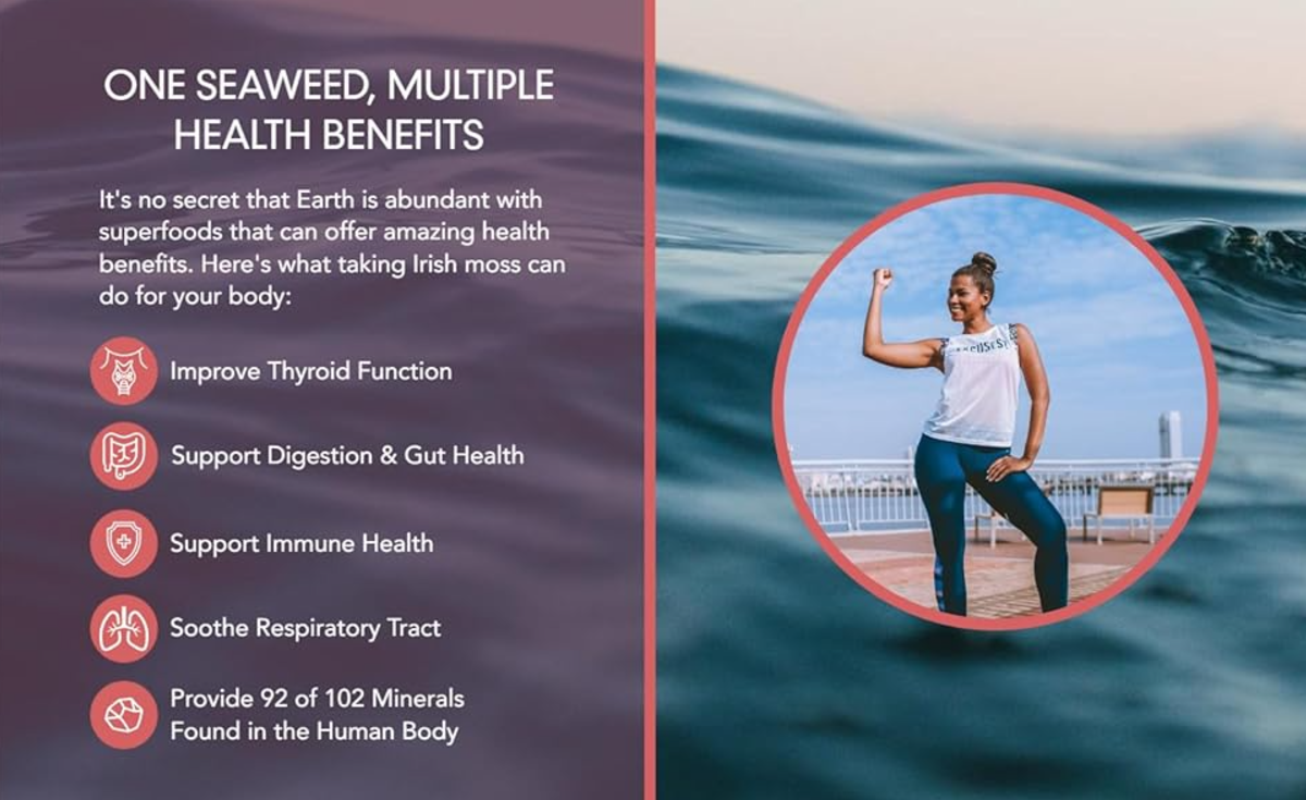 - Elevate Your Whole-Body Wellness With Organic Sea Moss Capsules—Dive into nature's gift! Our Irish Sea moss organic is ethically wildcrafted in the cold Atlantic ocean. It is brimming with vital nutrients, including 92 minerals and 19 amino acids. It boosts thyroid health and revitalizes energy levels.