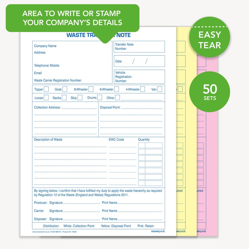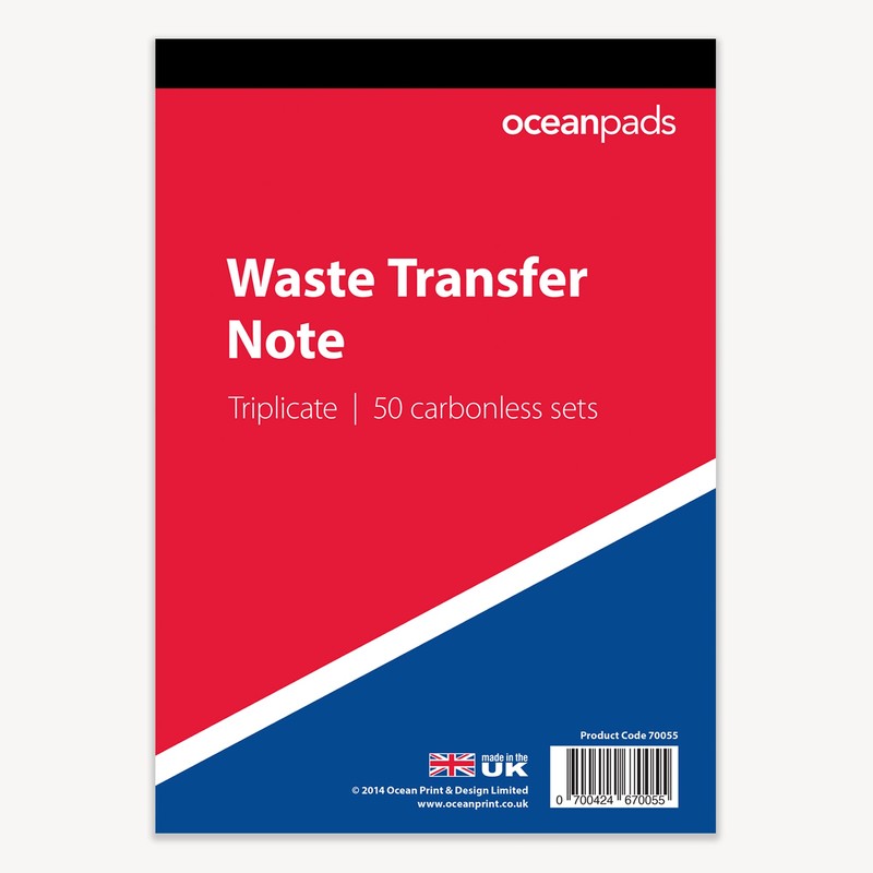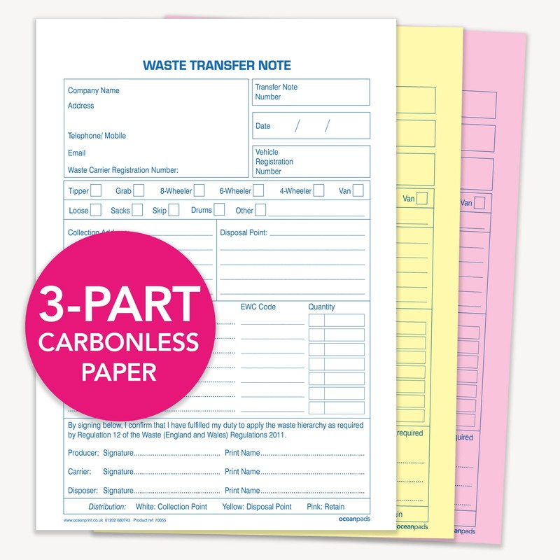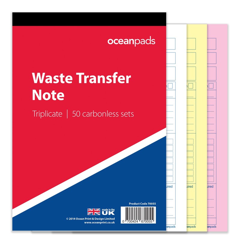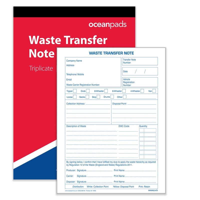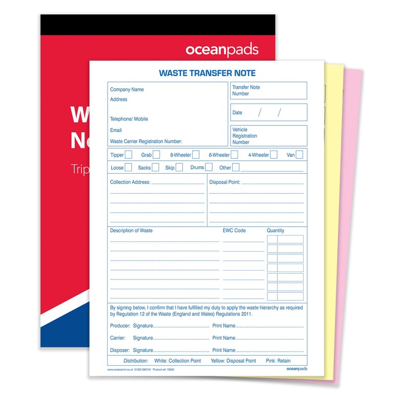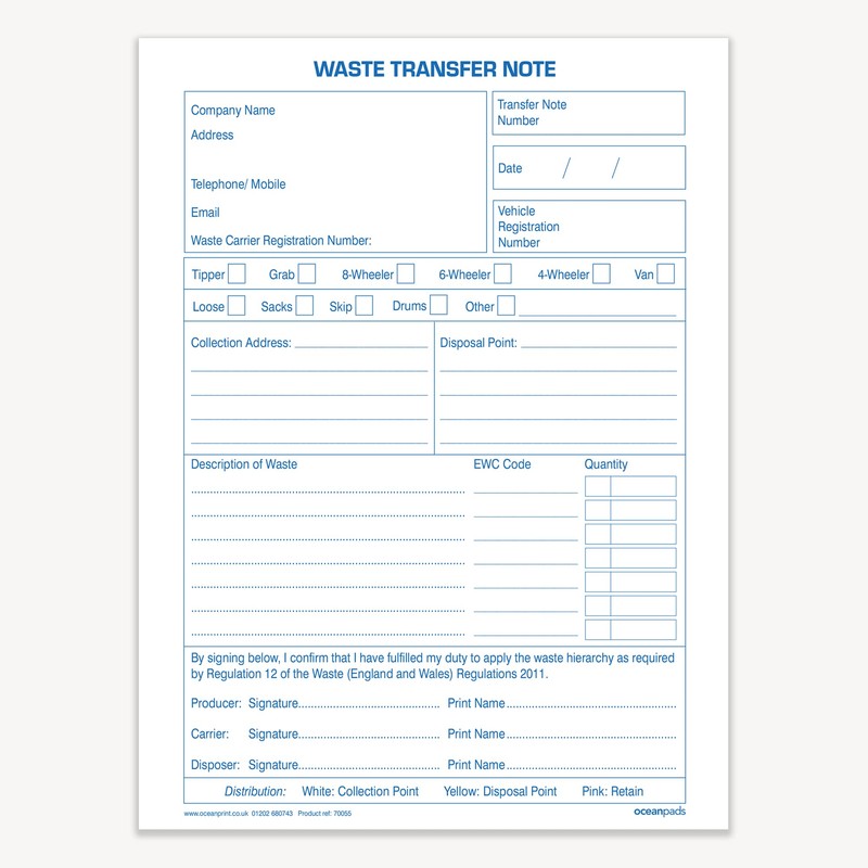 - Duty of care waste transfer note in triplicate providing a copy for the waste producer and carrier and consignee. This A5 book's pages are perforated at the head for easy page tear out. A writing shield is supplied to slip beneath the white copy and yellow copy before writing to prevent write-through.