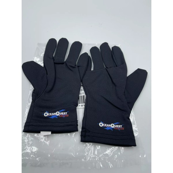 Ocean quest Spandex Glove Liners will not only make your gloves go on easy, they will help when you're donning your wetsuit too! Take the effort out of putting on your gloves and reduce the drag on your wrists when putting on your wetsuit. These 6 oz. (170 g) 4-way stretch Spandex glove liners are designed to be worn under your wetsuit gloves for easy donning and to create layering for added warmth. Not designed to be worn alone (you'll wear them out quickly) these Spandex Glove Liners have sewn seams and wrists for strength and easy donning. Ocean quest Spandex Glove Liners are black in color.