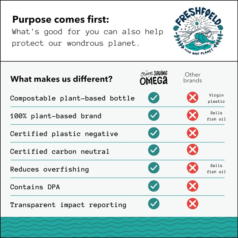 - Fish free omega-3 means it supports brain and heart health without harming delicate ecosystems.