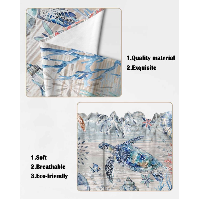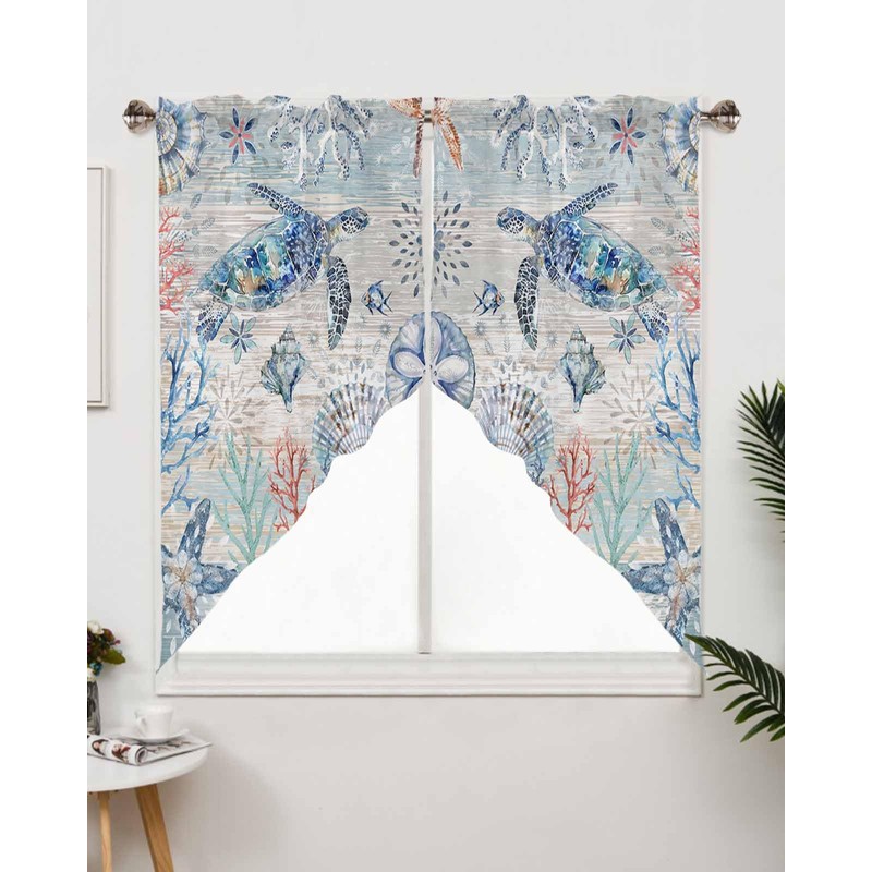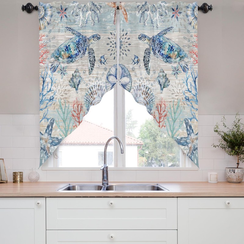 Ocean Sea Turtles Nautical Swag Valances for Windows Rod Pocket Kitchen Window Curtains Over Sink, Rustic Wood Beach Kitchen Curtains Sets, Swag Curtains Valance for Living Room, 28"x36" Set of 2