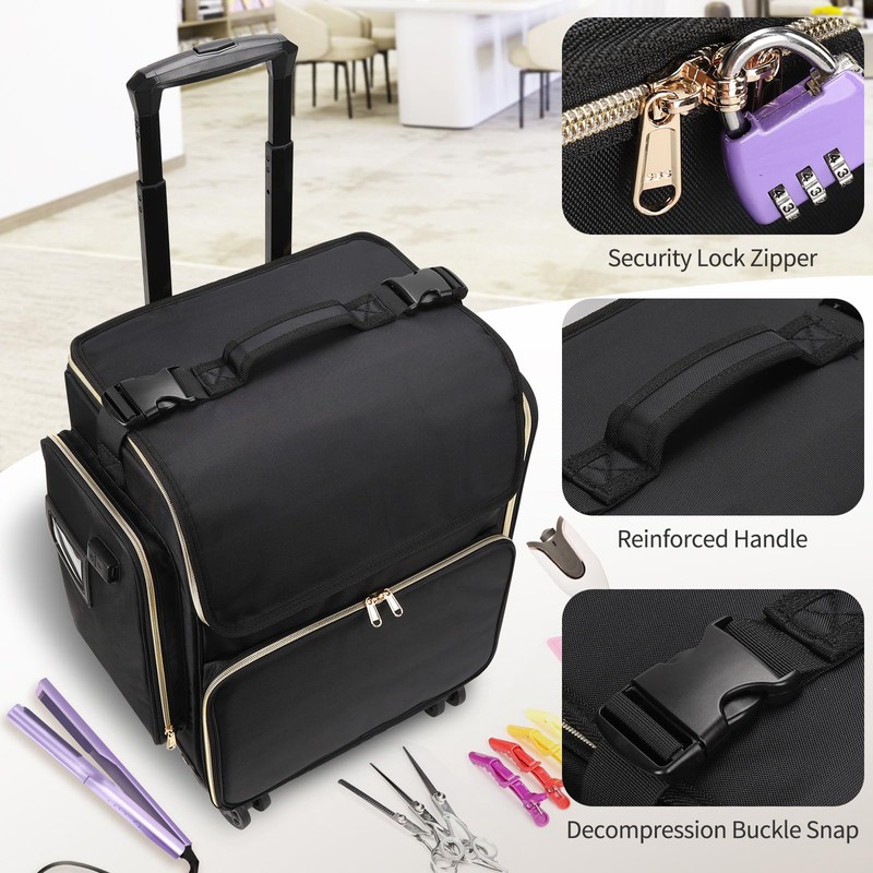 - Thoughtful Details Design - Hairstylist traveling case has following unique 1.the transparent detachable pouch can be taken off and placed on the tabletop.2. the zipper is designed with a small zipper lock. 3.Name tag or business card can be placed in the side pouch, 4.external USB charging port and built in charging cable, offers you a convenient way to charge your Electronic accessories while traveling