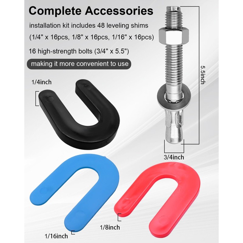- Complete Accessories: This lift installation kit includes 48 leveling shims (1/4" x 16pcs, 1/8" x 16pcs, 1/16" x 16pcs) and 16 high-strength bolts (3/4" x 5.5"), providing the necessary components for your lift installation, no additional purchases are needed, making it more convenient to use