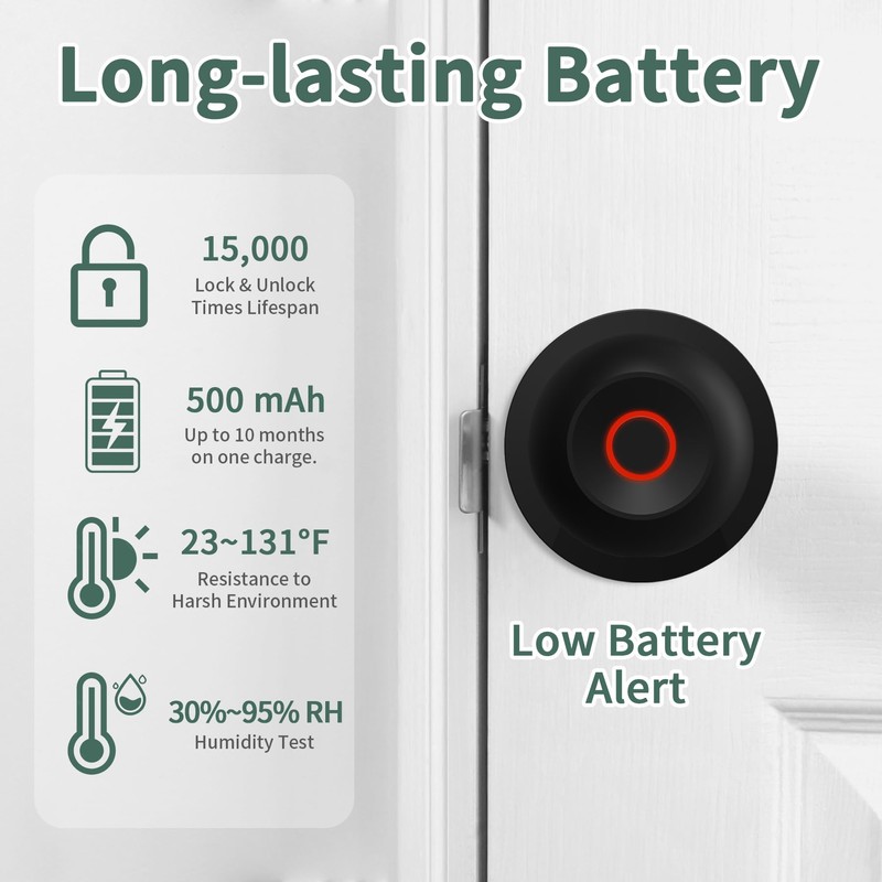 - Rechargeable Battery: Smart door knob has long battery life and lasts 8 to 12 months after 3 hours charging. This lock also features a visual power display on app and a low-battery alarm function. Better choice for Bedroom Office Apartment.
