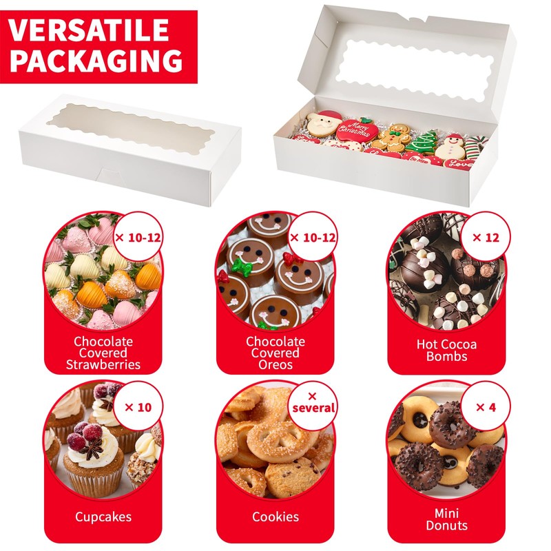 - Auto-Popup Bakery Box: Package includes 20pcs 12.5 x 5.5 x 2.5 inches white cookie boxes with windows and 24pcs "Thank you" stickers, these boxes are perfect for packing cookies, chocolate strawberries, pastries, muffins, donuts and more
