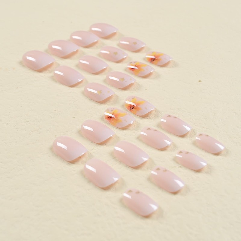 OCOUYVD Fall Press on Nails Short Square Fake Nails with Maple Leaf Foil Designs French Gradient False Nails Cute Short Acrylic Press on Nails Glossy Nude Stick on Nails Reusable Artificial Nails for Women