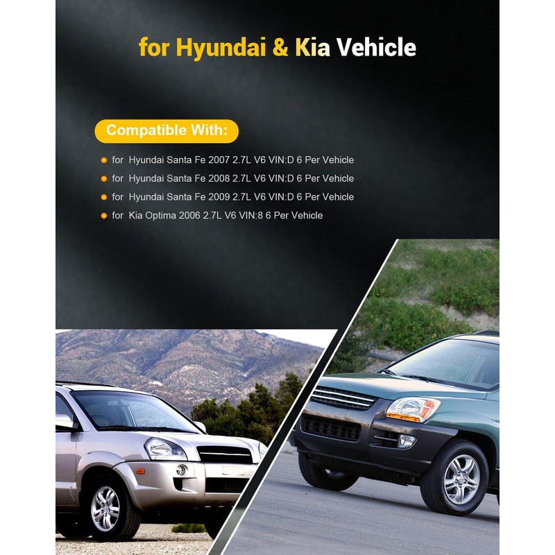 • Compatible Vehicle : Compatible with for Hyundai Santa Fe 2007-2009 2.7L V6 VIN : D 6 Per Vehicle,for Kia Optima 2006 2.7L V6 VIN : 8 6 Per Vehicle
